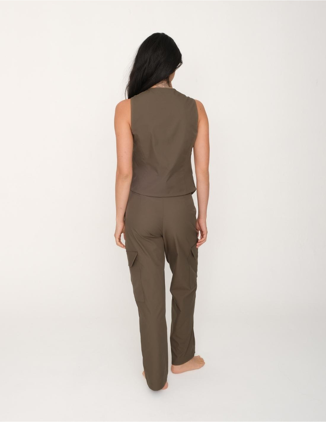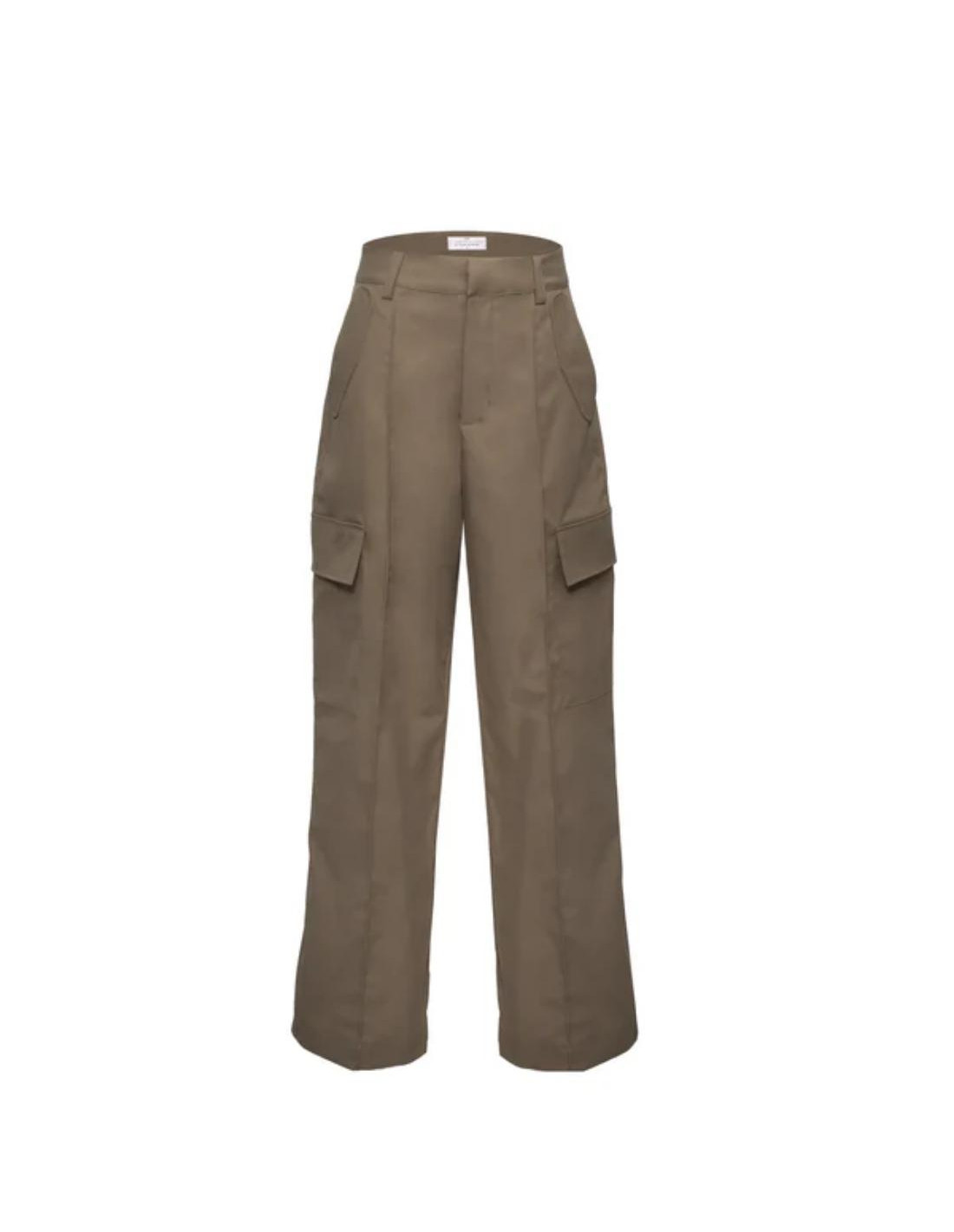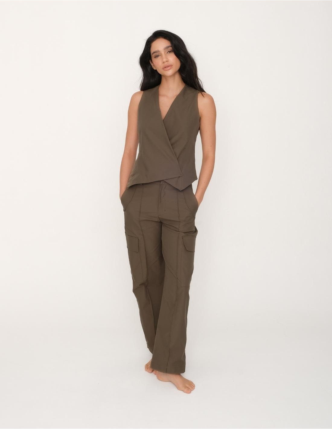 Mid-rise trousers. Pleat detail. Side and mid-thigh pockets. Plain waistband. Front zip and button fastening.