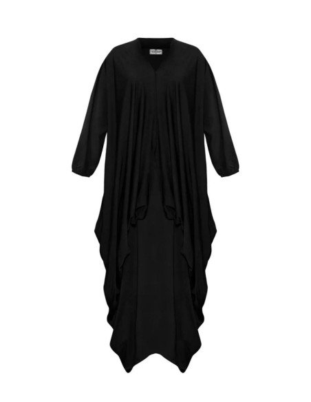 Black dress, two-piece set (top and bottom). V-neck, long sleeves with elastic cuffs. Front pockets. Asymmetrical hem. Can be worn loose, tied, or belted.