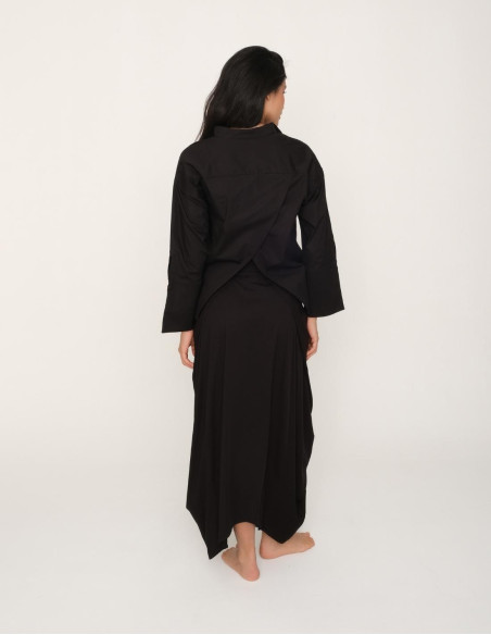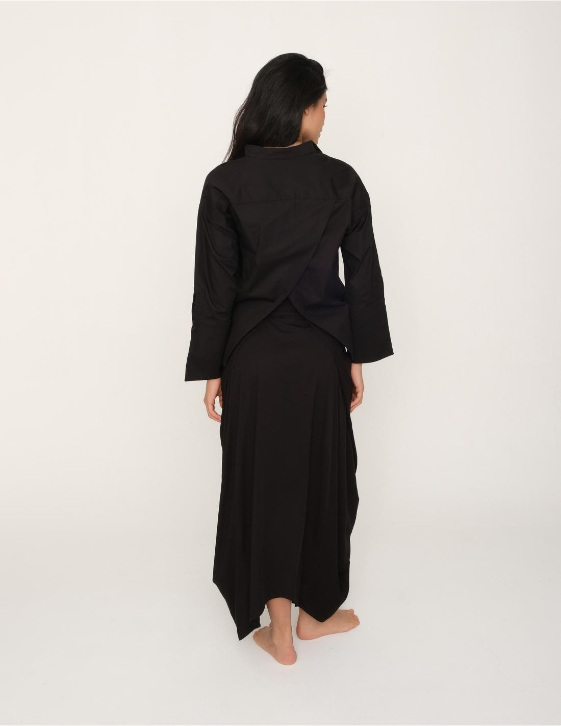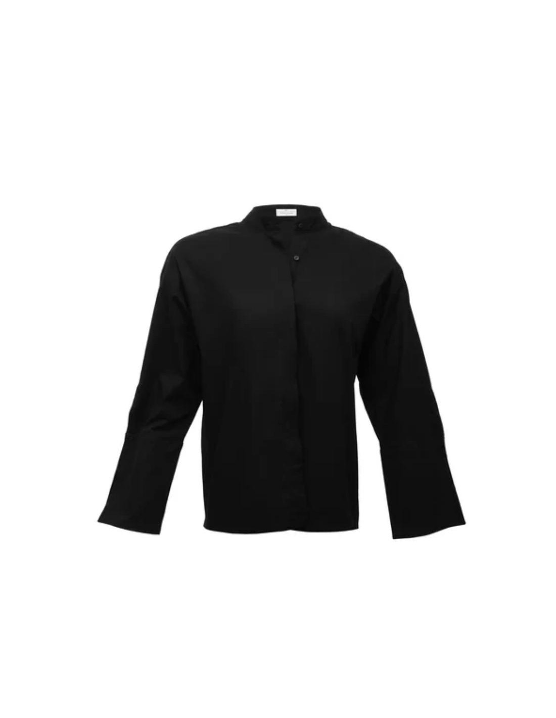 Loose-fitting, long-sleeved blouse. Features a mandarin collar and V-neck. Front button closure with matching buttons. Asymmetrical back hem. Asymmetrical cuffs with buttons.