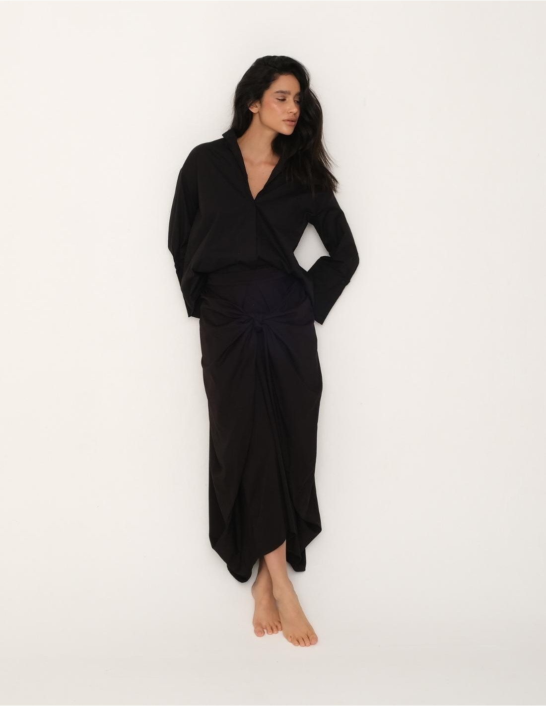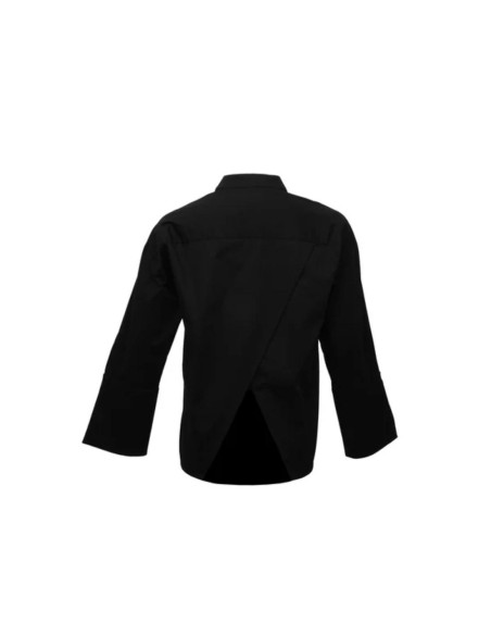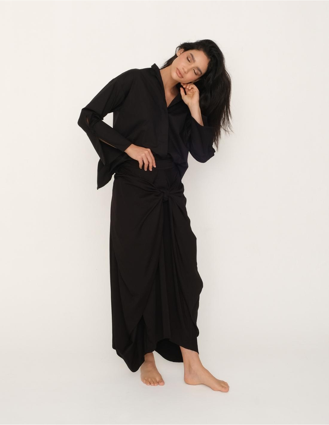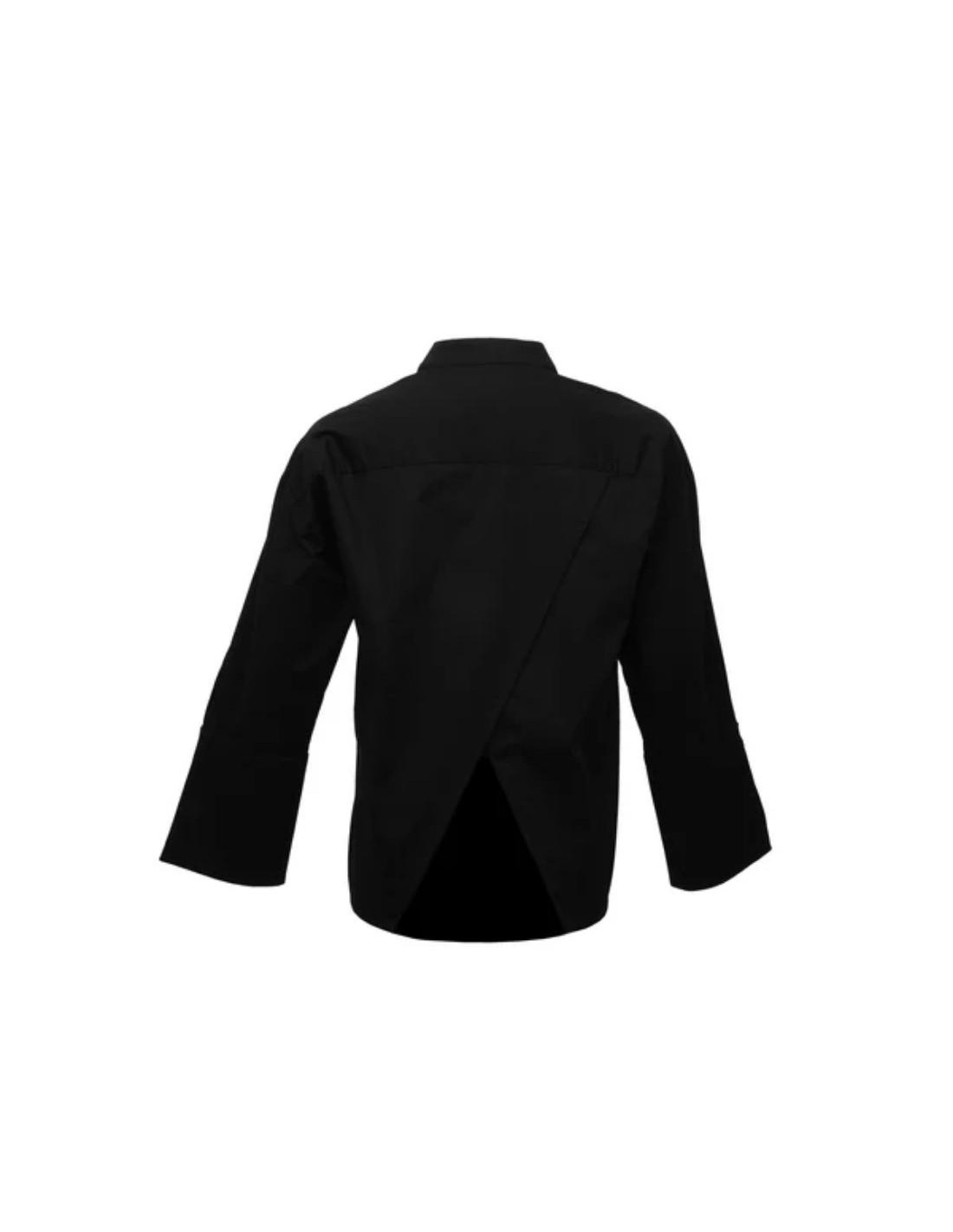Loose-fitting, long-sleeved blouse. Features a mandarin collar and V-neck. Front button closure with matching buttons. Asymmetrical back hem. Asymmetrical cuffs with buttons.