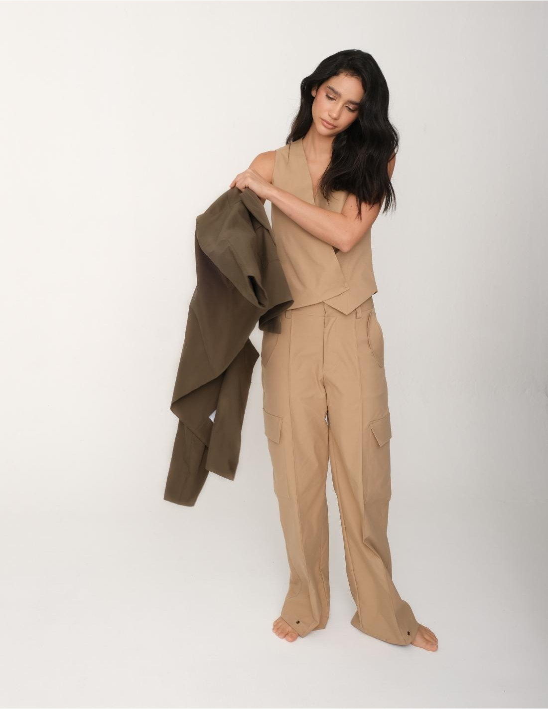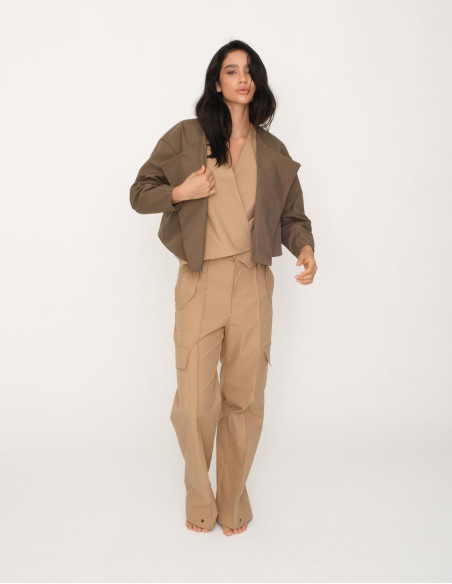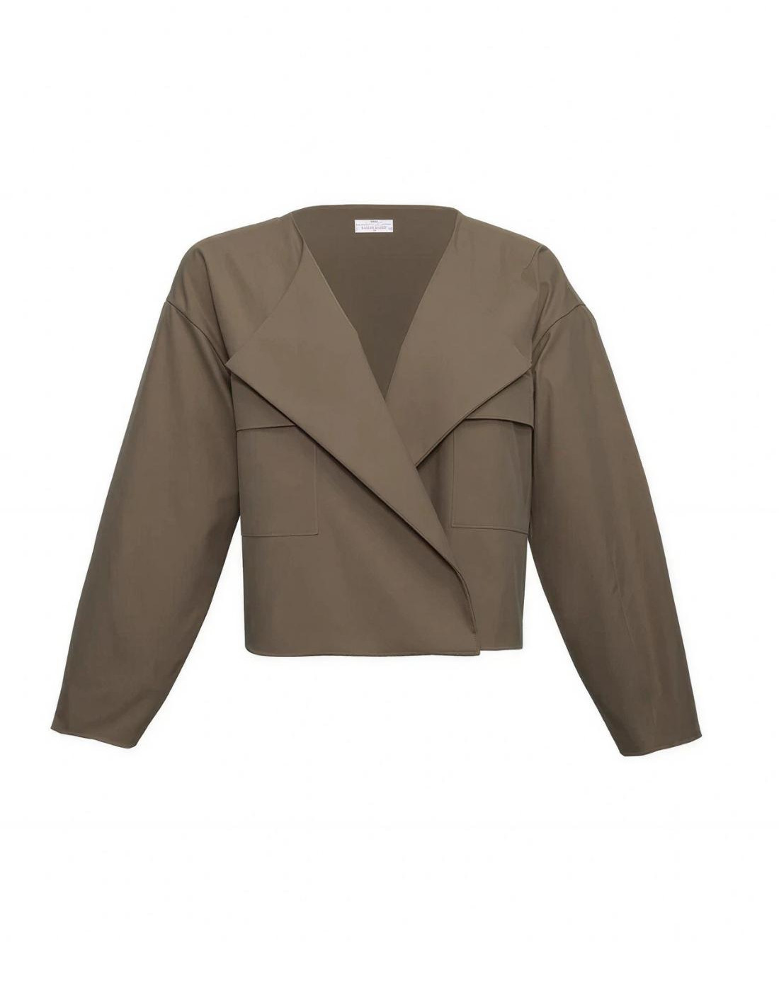 Coat with a V-neck and long sleeves. Asymmetrical front lapels. Front pockets.